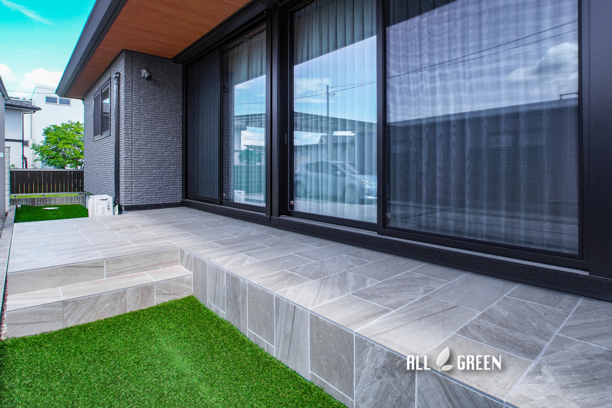 お庭部分は、タイルデッキと人工芝でコーディネート。お部屋の中から気軽に外へ出られる設計とし、室内とのつながりを感じられるよう工夫しています。タイルデッキと人工芝はどちらもメンテナンスが簡単なので、手入れの負担を抑えつつ、年間を通じて緑豊かな暮らしを楽しめるのが魅力です。日々の生活に自然の安らぎをもたらす心地よいお庭空間が完成しました。