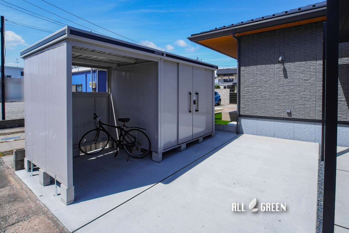 シンプルながらも洗練された雰囲気が漂う邸宅になじむよう、外構はグレー系のトーンでまとめ、全体的に落ち着きのある上品な雰囲気に仕上げました。カーポートには、三協アルミの「カーポートFⅡ」を採用。直線的なシャープなデザインが外構全体と美しく調和し、ファサード全体にすっきりとした印象を与えています。柱と屋根をブラックで統一することで、空間に適度な重厚感が生まれ、シンプルながらも存在感のある仕上がりに。床面は土間コンクリートで整え、重たくなりすぎずスッキリとした印象を保ちながら、耐久性と使い勝手にも配慮しました。これにより、駐車スペース全体が落ち着きと清潔感を兼ね備えた快適な空間となっています。駐車スペースの南側には、収納スペースとオープンスペースが一体となった、ハイブリッド型物置、ヨドコウの「エルモコンビ」を設置し、自転車などを置ける実用性の高い空間に。収納部分は鍵付きで安心して大切なものを保管でき、オープン部分は出し入れがしやすく、日常使いにとても便利です。限られたスペースを有効活用しながら、使い勝手とデザインを両立されたアイテムとなっています。