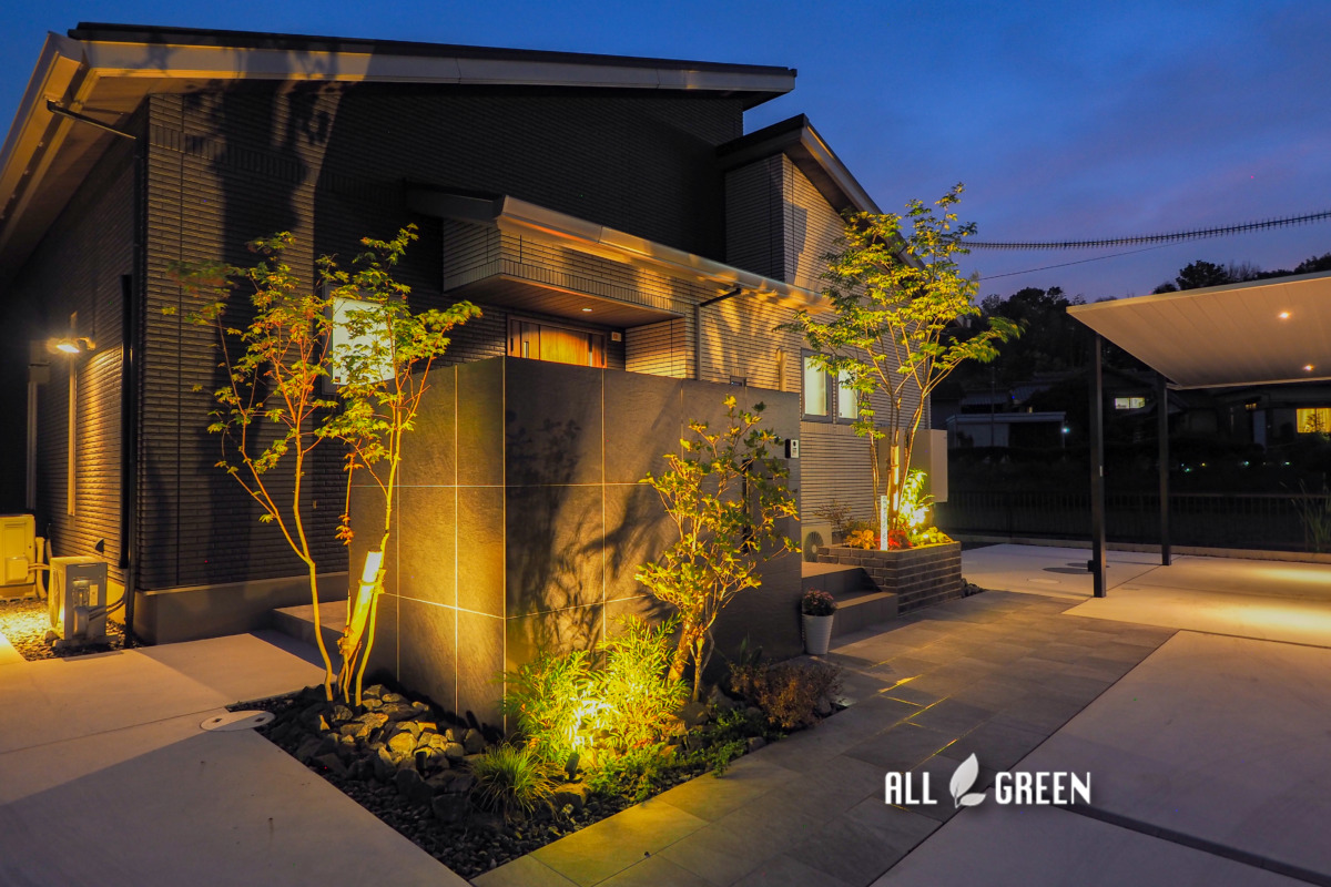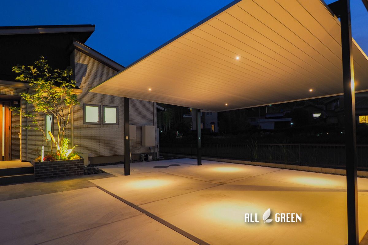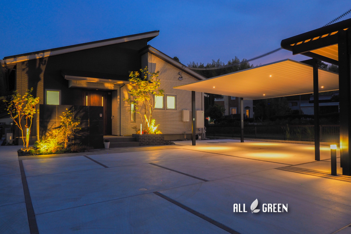 夜になると、アプローチやカーポート、門柱やガレージなどそれぞれのポイントに配置された照明が空間に奥行きと温かみを添え、まるで高級リゾートのようなラグジュアリーな雰囲気を醸し出し、邸宅の美しさをより際立たせてくれます。昼間は開放的で落ち着きのある空間が広がり、夜は幻想的な光に包まれる、時間によって異なる魅力を楽しめる外構が完成しました。