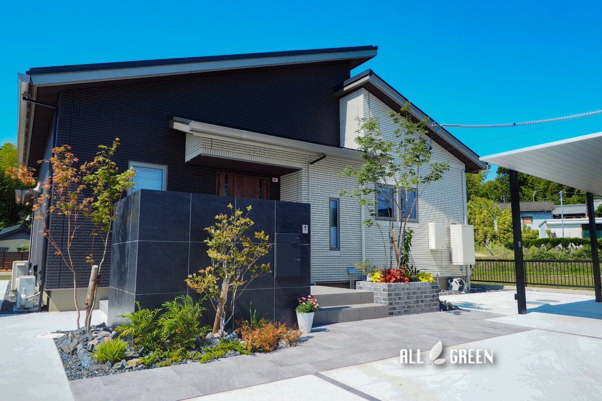 広々とした敷地をゆったりと活用した、開放感あふれるオープン外構。片流れ屋根の邸宅に調和するよう、エクステリアの配置に工夫をしながら外構のプランニングを進めていきました。