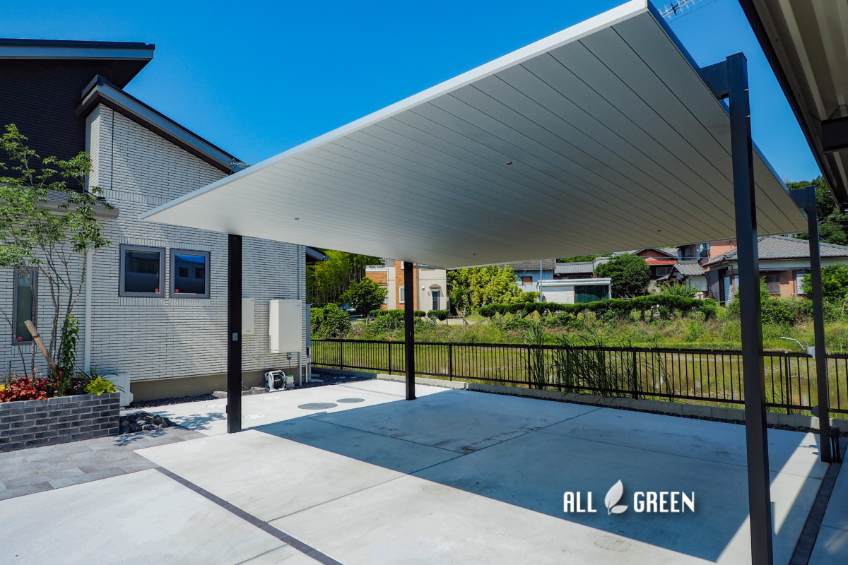 駐車スペースには、無駄をそぎ落としたミニマルなデザインが魅力的な「カーポートFⅡ」を採用。ツートーンカラーの邸宅に合わせ、カーポートもツートーンカラーで仕上げたことで全体にまとまりが生まれ、スタイリッシュかつシャープな雰囲気の駐車空間が完成しました。