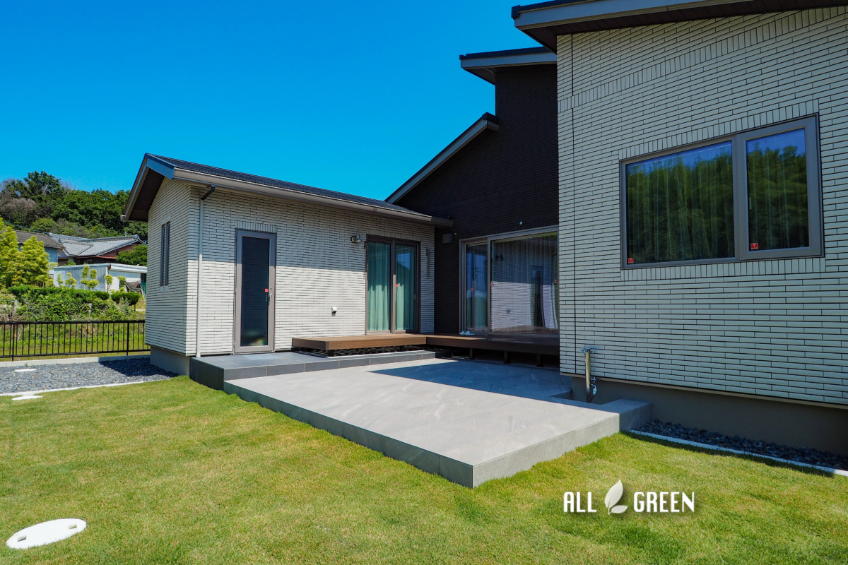 華やかさと落ち着きさを兼ね備えた門まわりには、マットな質感で上品な印象のタイル門塀を設置。周囲にはバランスよく植栽を配置し、シックな雰囲気の中にグリーンの柔らかな彩りが加わることで、重くなりすぎず、訪れる人をやさしく迎え入れる空間に仕上りました。そして建物裏側のお庭スペースにも暮らしをより豊かにする工夫を施しています。リビングからフラットにつながるタイルデッキの上に、温かみのある木目調の「ファンデッキ」を施工したことで、デザイン性と快適性を兼ね備えたアウトドアリビングとしても活躍する心地よい空間に。さらに、お庭一面に敷き詰められた天然芝が四季の移ろいを感じさせ、大切な人との時間や趣味に没頭するひとときなど、日々の暮らしにそっと寄り添ってくれる、そんなお庭が完成しました。
