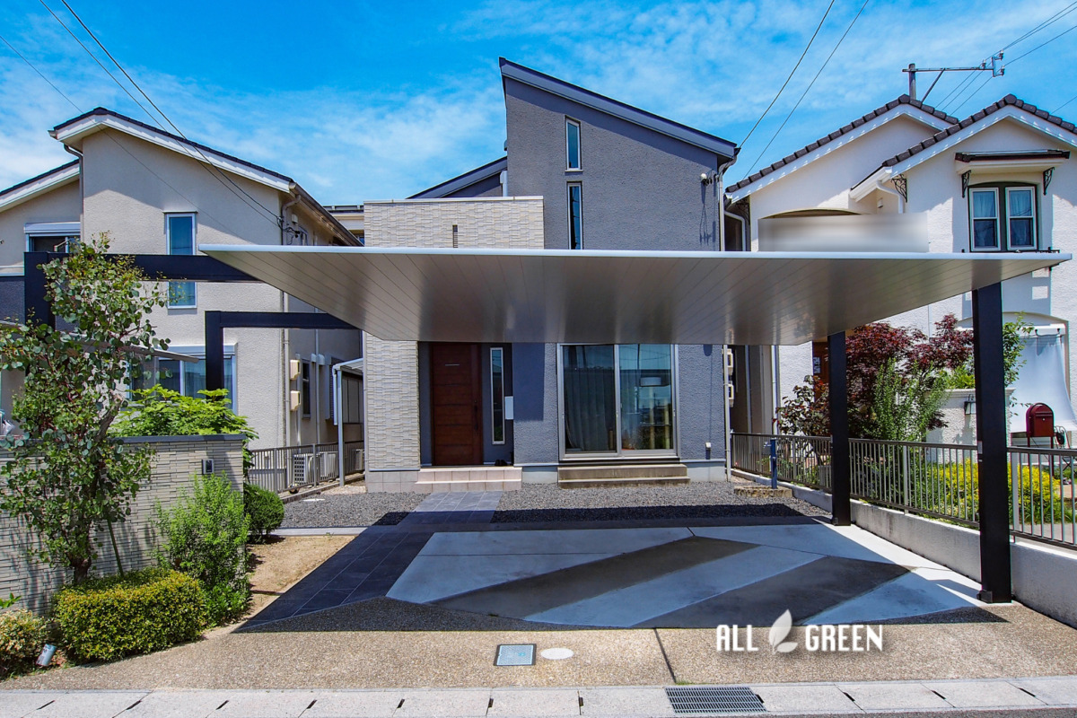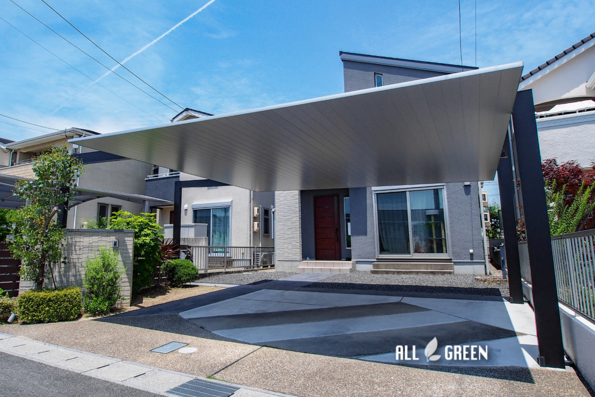 | エクステリア商品 | 駐車場:土間コンクリート(金鏝仕上げ) 目地:伸縮目地 カーポート:LIXIL/カーポートSC 2台用梁延長 60-57型 ロング柱 梁間口:81(柱:ブラック 屋根:ナチュラルシルバーF) アプローチ:MSC/ルッコ20(ブラック) TOYO/エクレルボーダー(ダークグレー) 既設芝:撤去・処分 防草シート+砂利敷き |