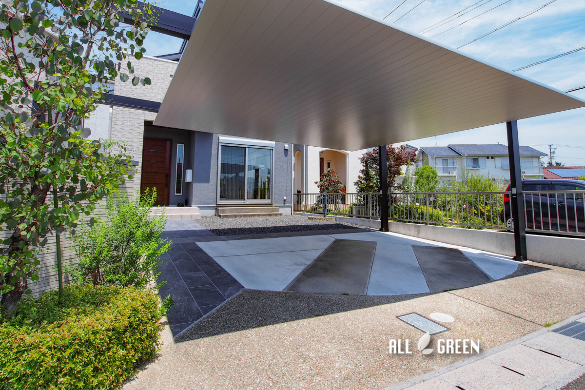 駐車場の床面には扇形の目地をデザインとして取り入れ、単調になりがちなコンクリートに動きと表情をプラス。さらに、目地を入れることでひび割れを防ぎつつ、空間に自然なアクセントを加え、上品な印象に仕上げています。お客様がご要望されていたカーポートには、LIXILの「カーポートSC」を採用。直線的でスタイリッシュなデザインが特徴で、外構全体にすっきりとした印象を演出しています。今回は梁を敷地いっぱいまで延長して施工したため、ファサードにエントランスゲートのような迫力が生まれました。見た目はもちろん、駐車スぺースを広々と使えるので、大きなお車でも余裕をもって駐車をすることができる、使い勝手の良いスペースに仕上がっています。