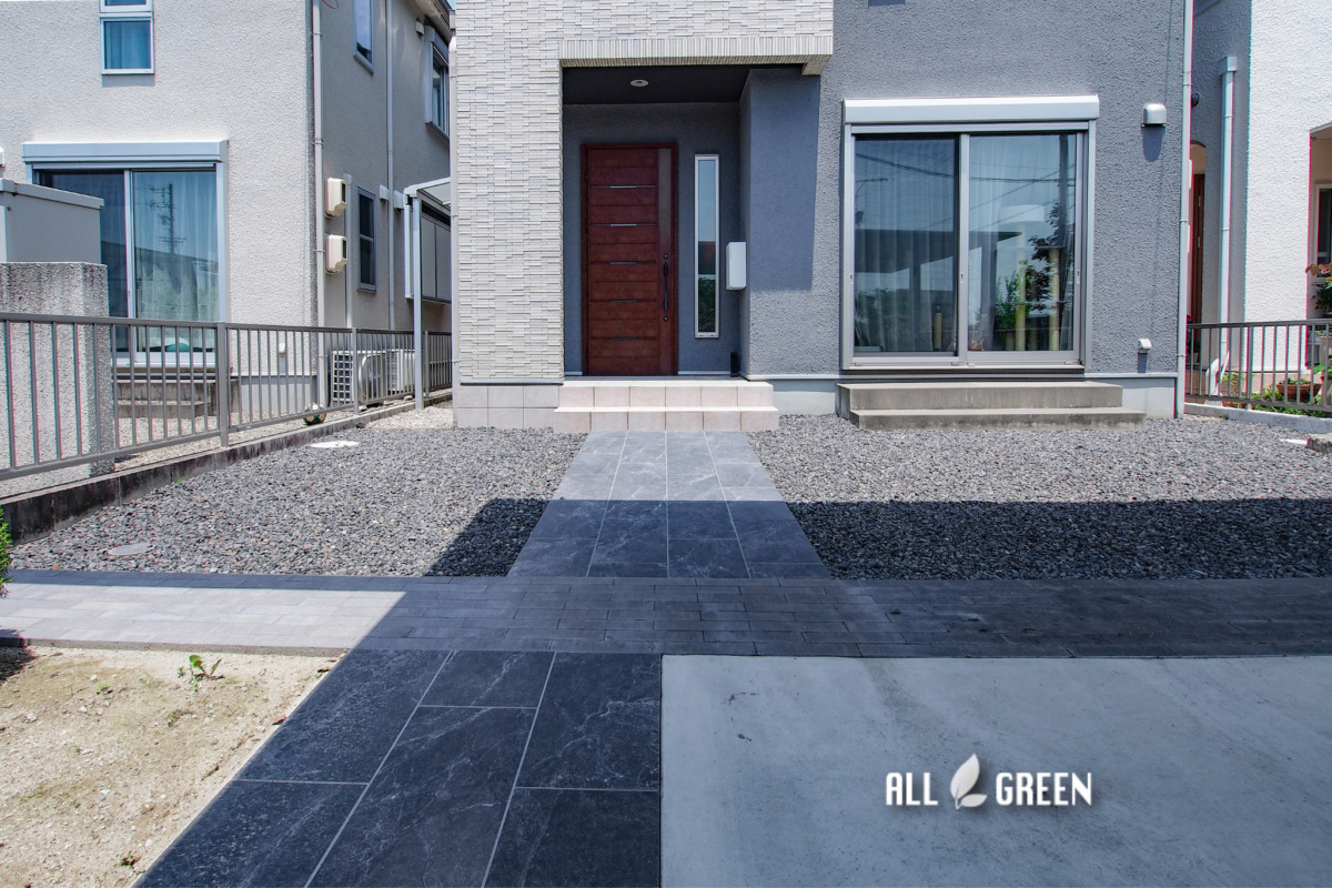 グレー系で統一された砂利とタイルの組み合わせが、落ち着いた印象のアプローチを演出し、異なる素材の質感が空間に自然な表情を加え、掃除やメンテナンスもしやすいため、日常の使い勝手にも考慮された設計になっています。こうした工夫により、住む人も訪れる人も心地よさを感じられるアプローチに仕上がりました。