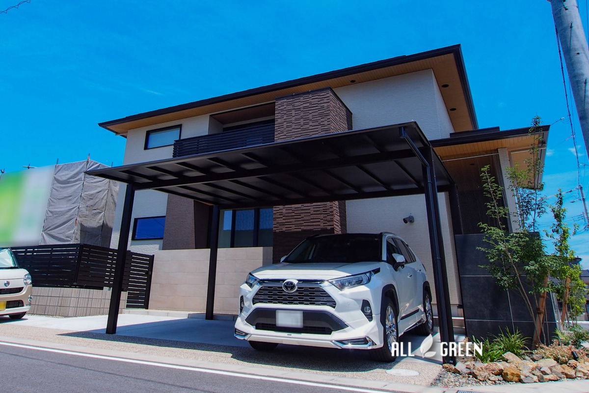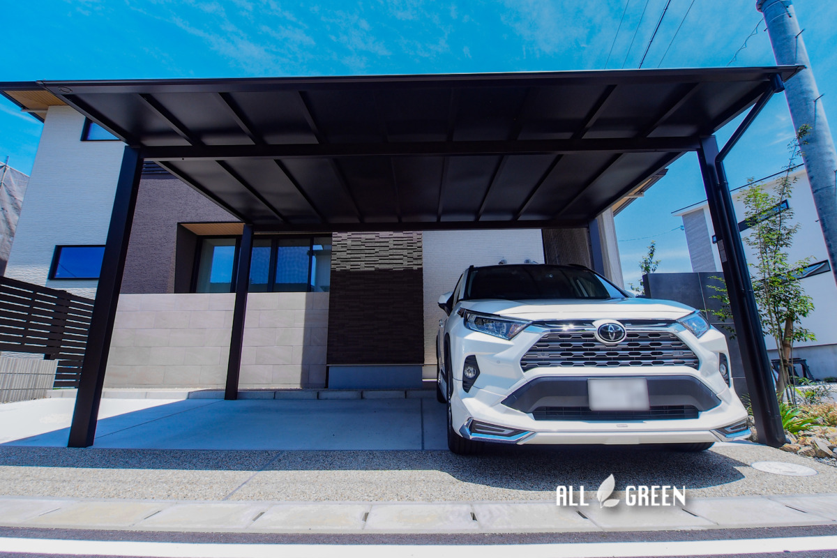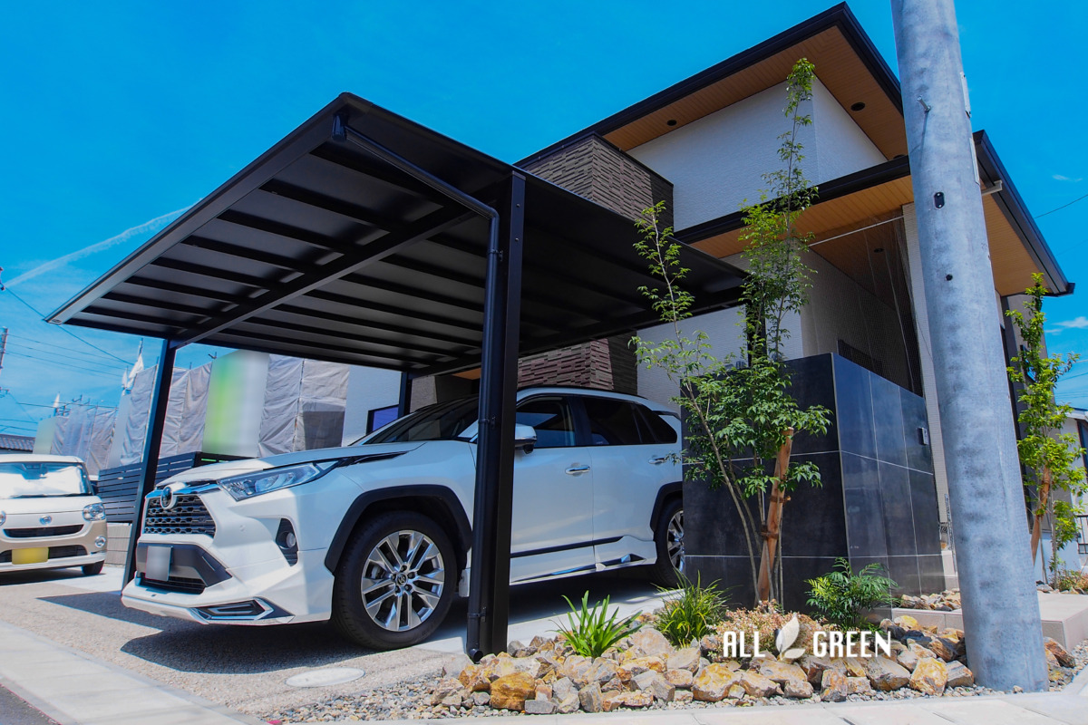 さらに、柱・屋根・梁をブラックで統一したことで、空間にまとまりが生まれシックで洗練された雰囲気に仕上がりました。屋根材にはブラックポリカーボネートを使用し、強い日差しや紫外線をしっかりと遮りながら、大切な愛車を守ります。見た目の美しさだけでなく、車内温度の上昇も抑え、日常の使い心地にも配慮しました。
