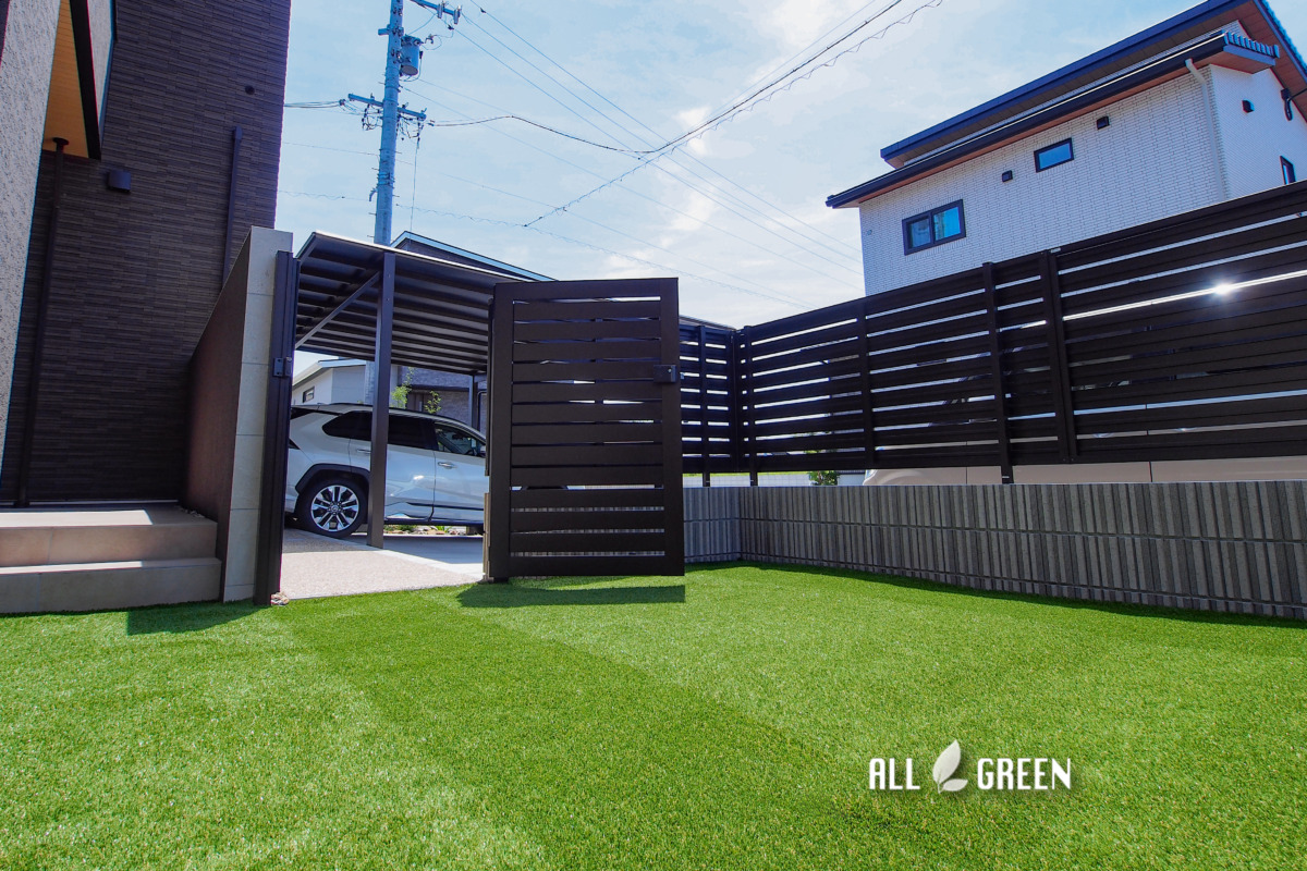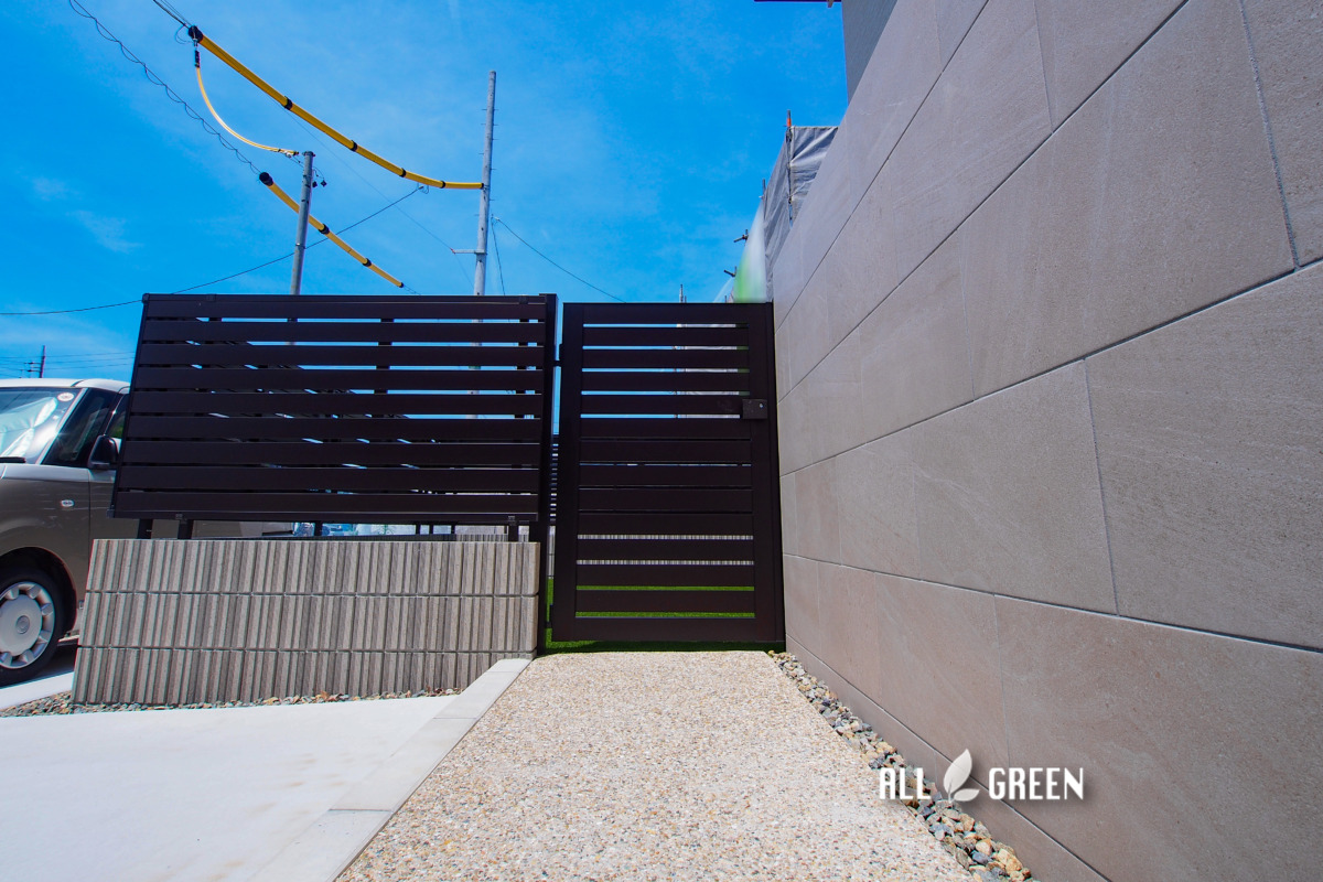 また、駐車場側から直接お庭へ入れるよう門扉を設け、動線の利便性も高めました。玄関を通らずアクセスできるため、ガーデニングやメンテナンス時にも便利です。お庭を囲うフェンスはUNISONのアルタ化粧ブロックを基礎とし、その上にフェンスを設置。門扉と高さを揃え、全体に統一感を持たせています。カラーも門塀や建物と合わせ、空間全体が調和するよう設計しました。