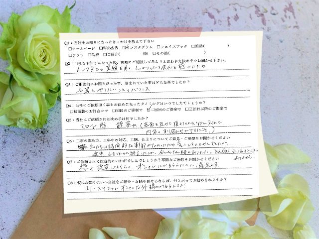 Q6:工事の進め方、工事中の対応、工期、仕上がりについてご意見・ご感想をお聞かせください