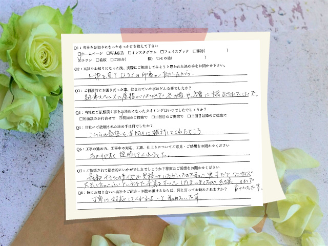 駐車スペースに屋根が無く悩んでいたところ、投函されたチラシとHPを見て印象が良かったので問い合わせました。結果的に予算オーバーしてしまったものの、丁寧な対応と高い提案力で、こちらの希望をよりよくしていただけたので頼んで良かったです。愛知県春日井市/U様邸