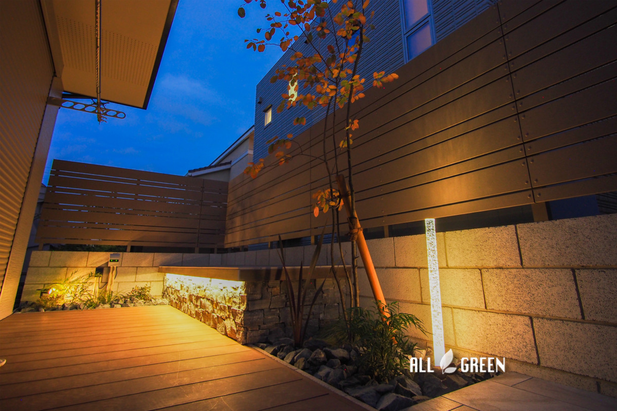 デッキスペースのベンチ座面下のバーライトと、植栽スペースに設置した「一条の光」ライトが穏やかでエレガントな空間を演出★☆
