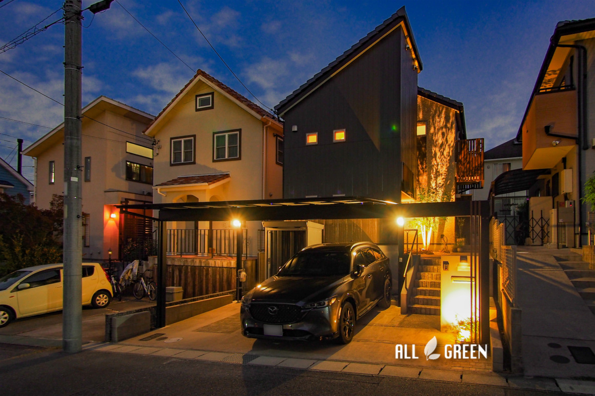 門塀前の植栽ライトがカーポートのデザイナーズパーツをさりげな~くアピールしているではありませんか!