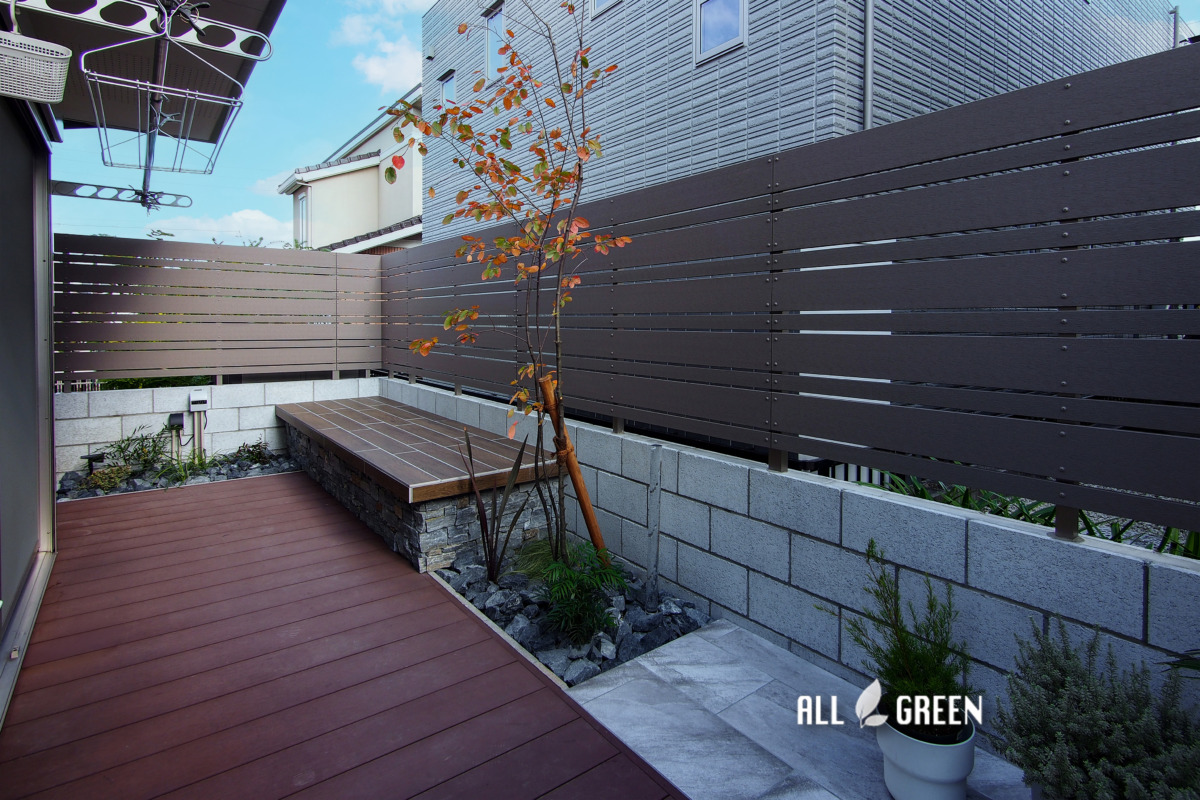 併せて、デッキスペースのフェンスには化粧コンクリートブロックの上に、土新建材のフェンス「エコモック」を施工。