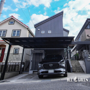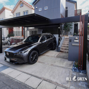 木目調のアクセントが印象的な邸宅との相性が抜群で、オリジナリティを持ったアプローチゲートとしての役割も果たすカーポートに仕上がりました。