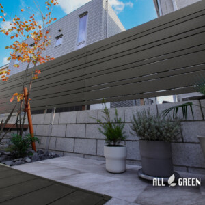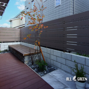 併せて、デッキスペースのフェンスには化粧コンクリートブロックの上に、土新建材のフェンス「エコモック」を施工。