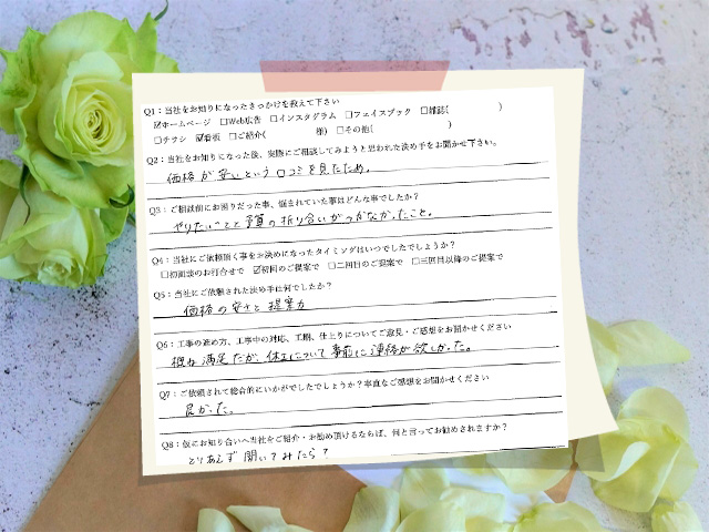 やりたいことと予算の折り合いがつかず悩んでいたところ、価格が安いという口コミを見て相談しました。確かに手頃な値段で、提案力も良かったので依頼することに。休工時の対応などはもう少し欲しかったですが、概ね満足しています。名古屋市緑区/I様邸