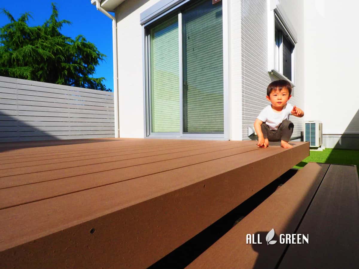 干割れやささくれの出ない人工木の樹ら楽ステージならお子様が裸足で上がってもけがの恐れなし。安心してお子様を遊ばせることができます。