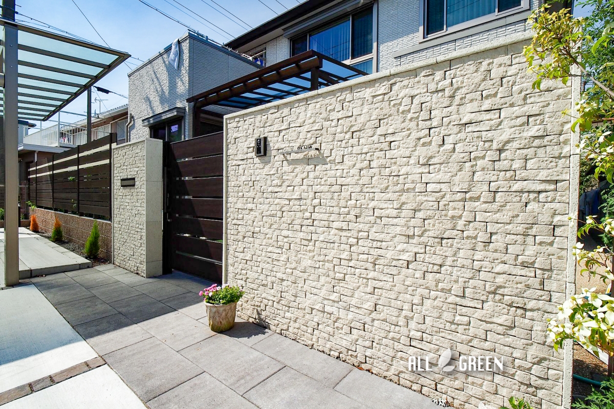 建物外壁と同じ凹凸のあるパストラーノはその柔らかい色合いから高級感とともに優しい印象も演出してくれるので、カーポートや門扉、そしてこれからご紹介させていただきますフェンスの木調色とも映える門塀となりました。
