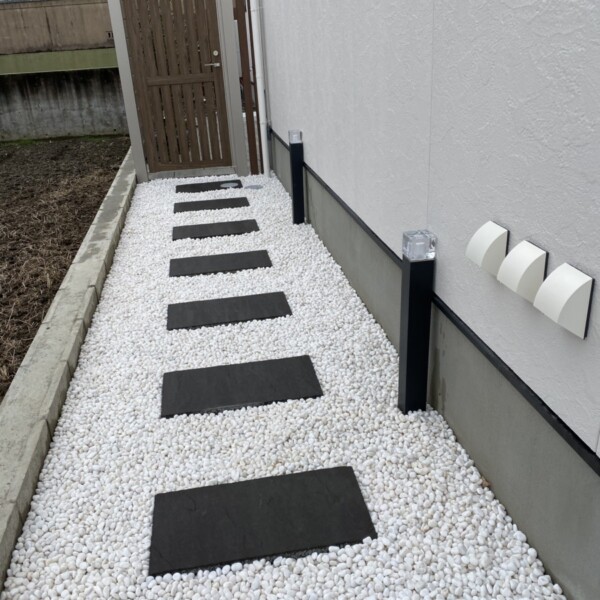 照明が完了しました。 アプローチ平板に真っ白の玉砂利で 素敵な雰囲気ですね。 夜の感じもいいと思います。