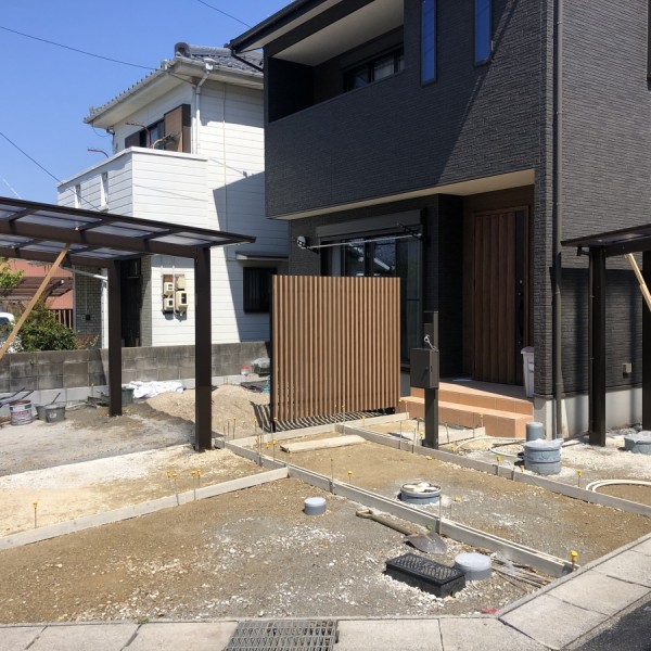 やっとカーポートとサイクルポート、フェンスの施工が終わりました。 この後はアプローチを洗い出しコンクリート仕上げ、駐車場土間コン...