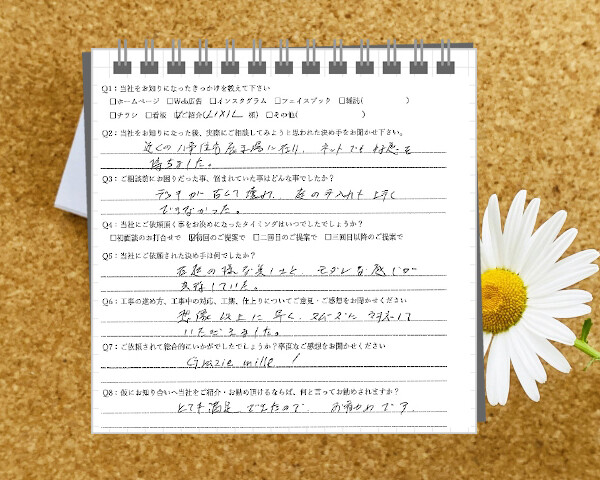 Q1:当社をお知りになったきっかけを教えてください ☑ チラシ、看板 Q2:当社をお知りになった後、実際にご相談...