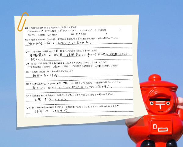 Q1:当社をお知りになったきっかけを教えてください ☑その他(近所) Q2:当社をお知りになった後、実際にご相談し...