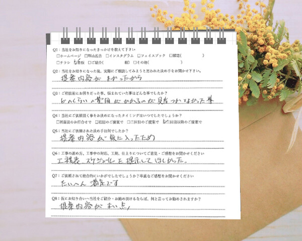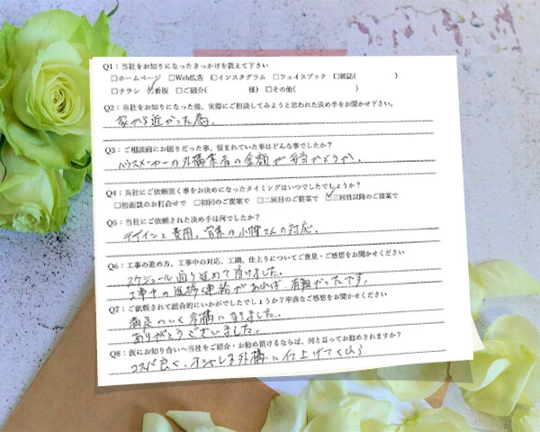 Q1:当社をお知りになったきっかけを教えてください ☑ホームページ☑その他(近くを通った) Q2:当...