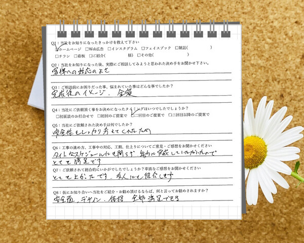 Q1:当社をお知りになったきっかけを教えてください ☑ 看板 ☑ その他(近所のため) Q2:当社...