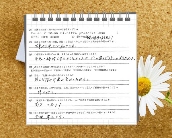 Q1:当社をお知りになったきっかけを教えてください ☑ その他( 隣地の補修工事を見て ) Q2:当社をお知りにな...