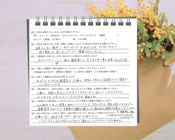 Q1:当社をお知りになったきっかけを教えてください ☑ ホームページ ☑ 看板 Q2:当社をお知りに...