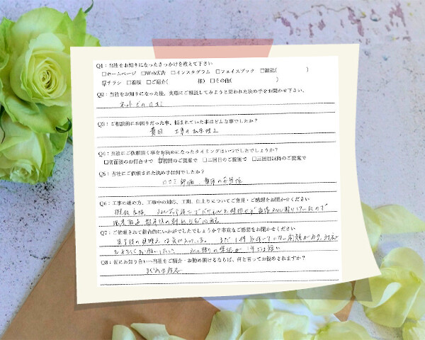 Q1:当社をお知りになったきっかけを教えてください ☑ その他( 娘宅の工事を見て ) Q2:当社をお知りになった...