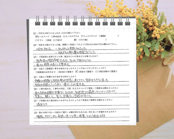Q1:当社をお知りになったきっかけを教えてください ☑ ホームページ Q2:当社をお知りになった後、実際にご相談し...
