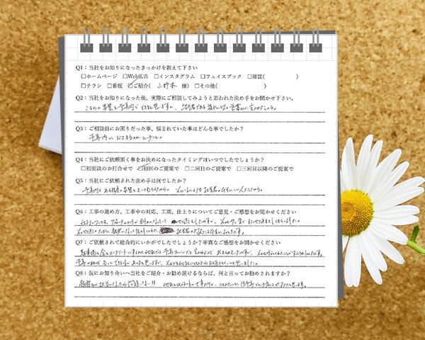 Q1:当社をお知りになったきっかけを教えてください ☑ その他( 家まわり全部やっていただきました。 ) Q2:当...