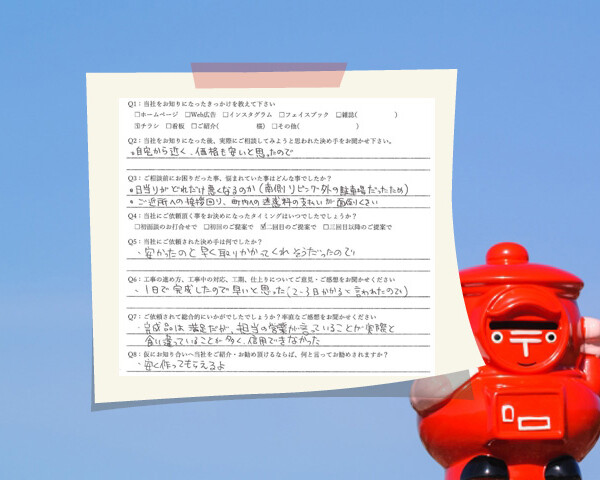 Q1:当社をお知りになったきっかけを教えてください ☑ ホームページ ☑ 看板 Q2:当社をお知りになった後、実際にご相談しよう...