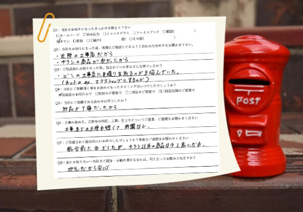 Q1:当社をお知りになったきっかけを教えてください ☑その他(店を見て) Q2:当社をお知りになった後、実際にご相...