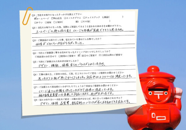 Q1:当社をお知りになったきっかけを教えてください ☑ホームページ ☑看板 Q2:当社をお知りになっ...